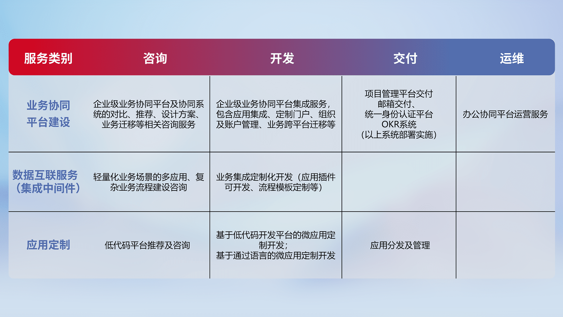针对钉钉、、企微、、、IDaas等平台级产品提供产品的规划、、、、方案、、、、交付、、定制化开发等服务,,,实现如统一协同办公、、智能客户服务、、、混合会议管理、、、智能数据查询、、、等业务场景,,,,实现数字化转型。。