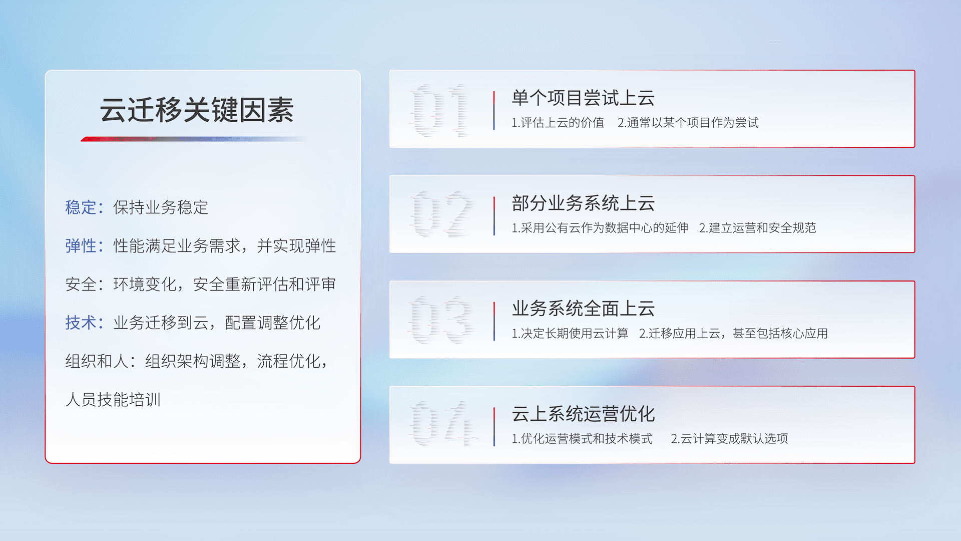 结合实际业务,,,,从规划设计、、云平台选型、、、、云原生改造、、、、数据迁移、、、集成交付,,,,迁移全过程为客户识别最佳上云路径,,,做好风险识别管理,,设计网络架构、、、、身份权限、、、、安全审计合规、、、、操作审计、、、、日志审计、、监控告警策略、、、、多站点容灾设计等,,,,对云上基础设施进行整体规划,,,,提升IT治理水平,,,以满足弹性、、、、高可用、、高性能的需求。。